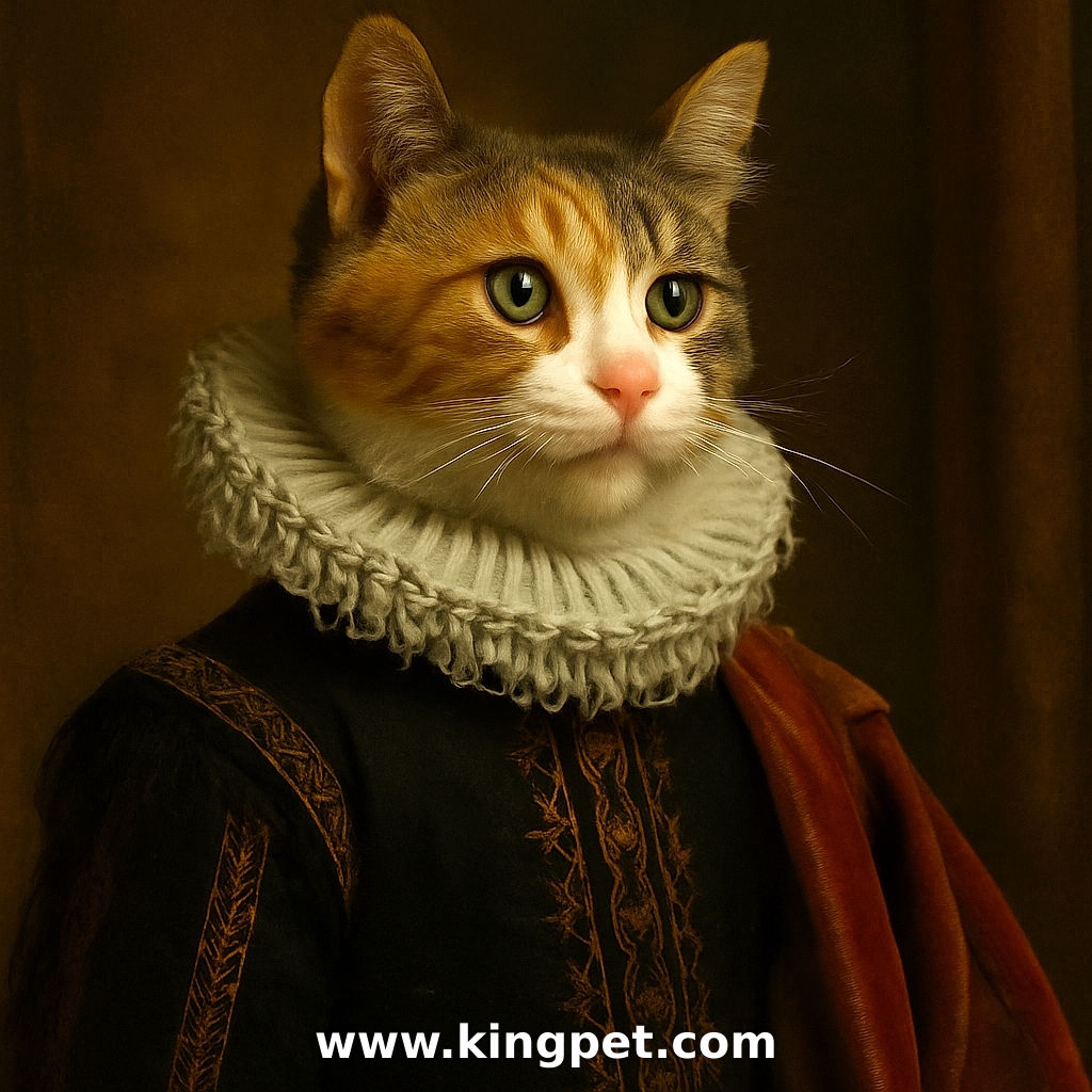 • A charming calico kitten stands proudly on a rock, gazing thoughtfully into the distance under a bright blue sky dotted with soft clouds. The lush green trees in the background add a peaceful outdoor vibe, making this a serene and heartwarming portrait of feline curiosity.
